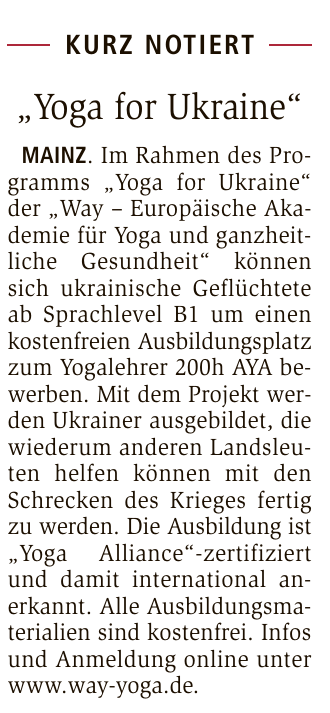 bei den WAY Europäische Akademien. Die WAY Europäische Akademien sind eine staatlich anerkannte Einrichtung der Weiterbildung nach §6 Abs.1 WBLVO M-V, sowie eine DIN ISO 90001 Qualitätsmanagementsysteme zertifizierte Lehrakademie und eine Marke der MACAMA Medien- und Bildungs-GmbH. Zahlreiche unserer Kurse sind von den Krankenkassen deshalb im Rahmen von §20 SGB Primäre Prävention und Gesundheitsförderung anerkannt und Yoga Alliance zertifiziert (AYA). Gesundheitserhalt, Fitness, Entspannung und Sport sowie die Entwicklung innerer Kraft und Stärke stehen im Zentrum unserer Lehre. Wir heißen Dich herzlich Willkommen in der WAY Community und freuen uns, dass Du zu uns gefunden hast.